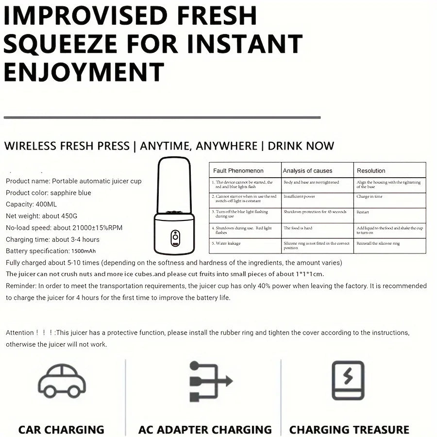 Product size: 100mm* 100mm*220mm Input: DC5V-1A Battery voltage: 5V-1800mAh Rated power: 40W Packing list: 1*Electric Juicer 1*Base